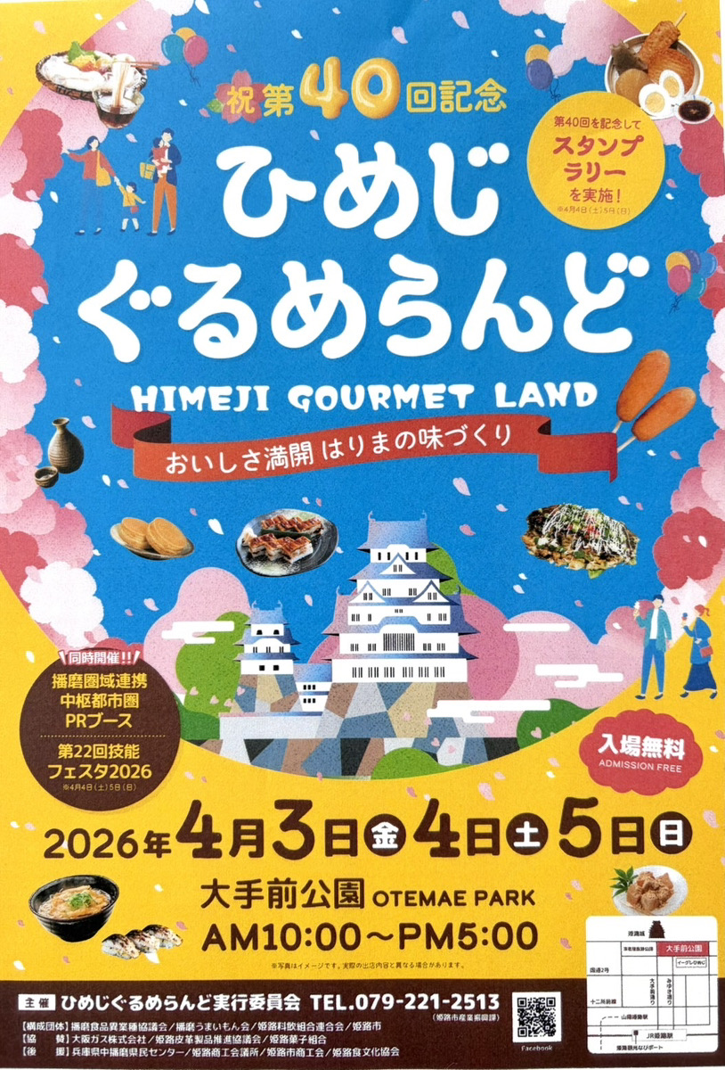 姫路の春を彩る食のイベント「ひめじぐるめらんど」が、大手前公園で開催されます。姫路・播磨の「食」を中心とした名産品や、特産品などのブースが、多数出店します。